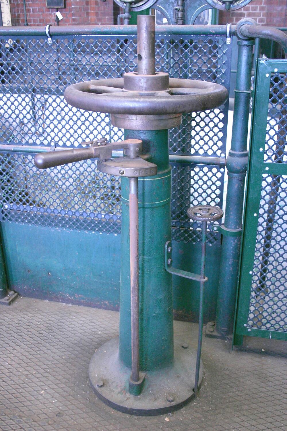 Hydraulic control for isolation valve of No.4 pumping well. Located in South Engine Room