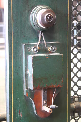 Electric warning bell associated with No.4 Pmp Well in the South Engine Room of Spotswood Pumping Station. Probably used as an alarm to communicate between workers above and below ground, perhaps as part of the operation of the single-person electric passenger lift fitted in the same well. The bell has a toggle switch with round baseplate wired to the bell on the same mounting board, which appears to have worked as an on/off siwtch to activiate the bell.