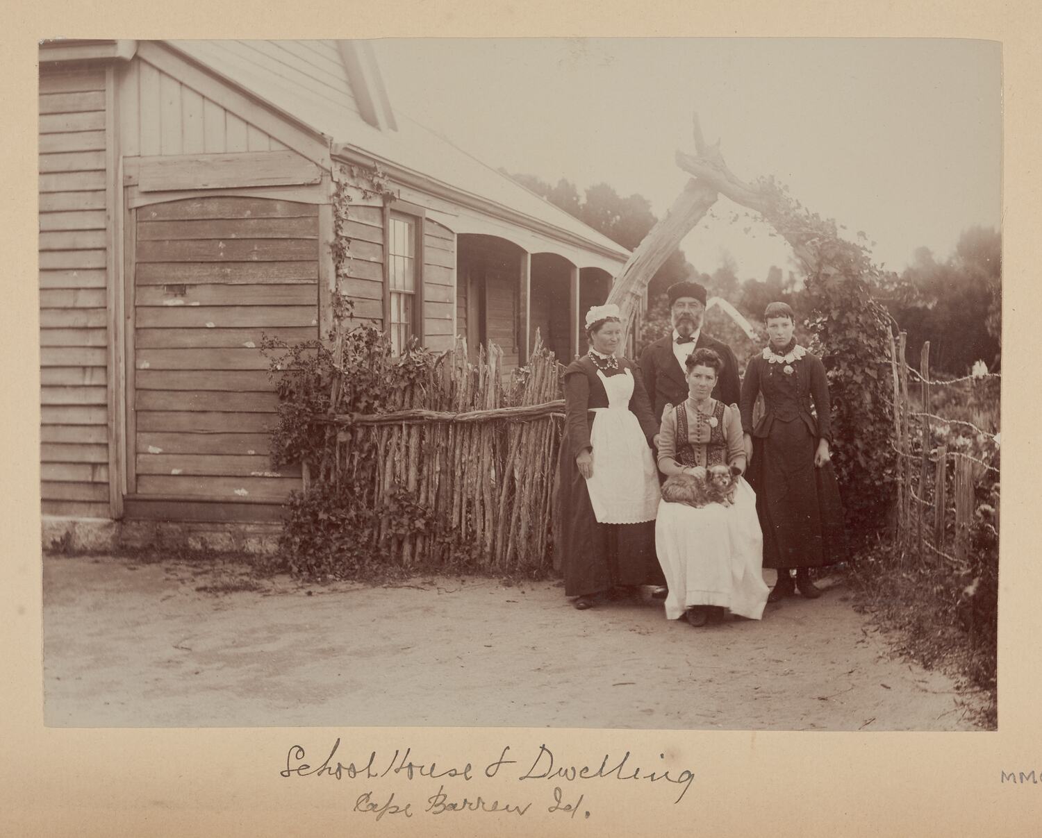 Edward Stephens, school master, and his family in front of the Cape Barren Island school house and dwelling. One of the three women, possibly Mrs Stephens, is holding a dog on her lap. Another of the women is wearing a bonnet and apron and is possibly the maid for the school teacher's family. Behind the group is a lychgate made of two tree trunks and a fence made of tea-tree branches. Photograph taken by Archibald J. Campbell during an expedition by the Field Naturalists Club of Victoria to the Furneaux Group of islands in November 1893.