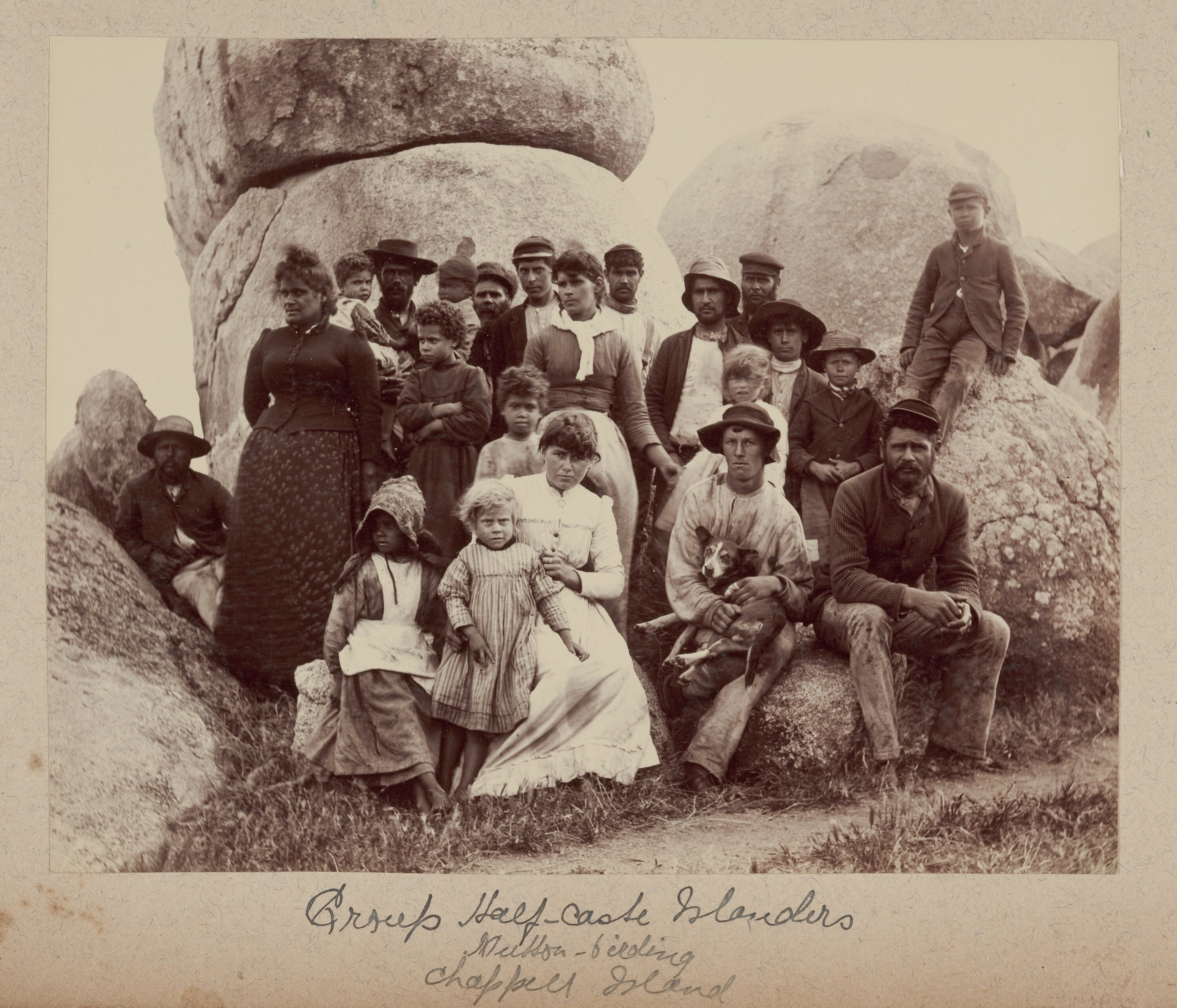 Caption below the photograph handwritten in black ink on backing board: " Group Half-caste Islanders Mutton-birding Chappell Island".