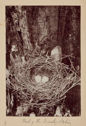 Caption below the photograph handwritten in black ink on backing board: " Nest of the Dusky Robin ".