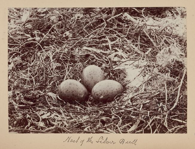 Caption below the photograph handwritten in black ink on backing board: " Nest of the Silver Gull ".