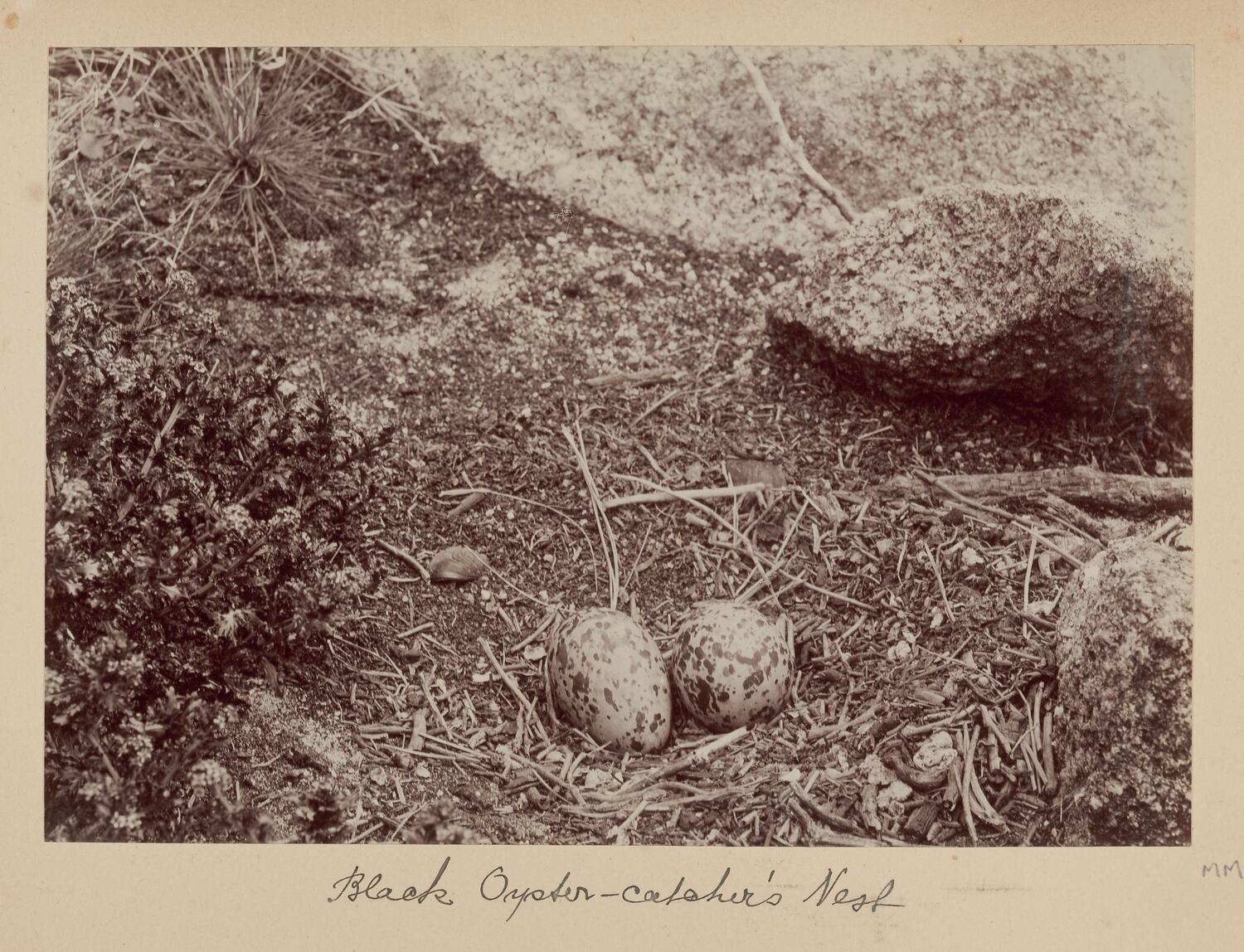 Caption below the photograph handwritten in black ink on backing board: " Black Oyster-catcher's Nest ".