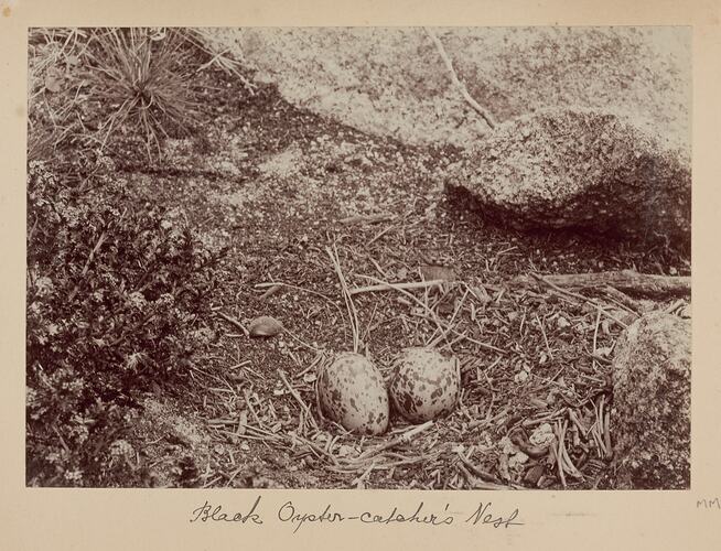 A nest with two eggs of the Black Oystercatcher on one of the islands of the Furneaux Group, Bass Strait. Photograph taken by Archibald J. Campbell during a scientific expedition by the Field Naturalists Club of Victoria to the Furneaux Group of islands in November 1893.
