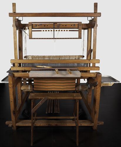 Countermarch Floor Loom made for Anna Apinis by fellow survivors of World War II, in Memmingen, a displaced persons camp in Germany with wood scavenged from bombed-out ruins. It was designed by Anna's husband Ervins. Anna used the loom to weave traditional Latvian designs using threads gathered by unravelling old scraps of fabric. Anna brought the loom with her to Australia and continued to weave Latvian designs on it, both traditional and experimental. She also taught her daughter Anita to weave on this Loom and together they kept alive their Latvian culture.