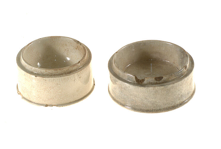 Description for Parent Record: 2 ceramic jar bases. 1 with a concave bowl and an impressed mark on the base, reading 'II...H&J', base diameter 65mm, possibly an ointment or paste jar. 1 with flat bowl and an impressed number reading '10' on the base with a diameter of 71mm. Both are clear glazed.