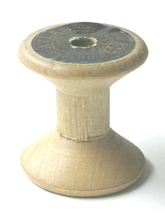 Wooden spool "Atlas Superior" from the countermarch floor loom, circa 1945. Which was constructed for Anna Apinis by fellow survivors of World War II in a displaced persons camp in Germany, using wood from bombed out ruins. Anna painstakingly sketched and documented ancient Latvian designs from the regional costumes rescued by other Latvian refugee women. She then wove them on her loom with threads gathered by unravelling old scraps of fabric.