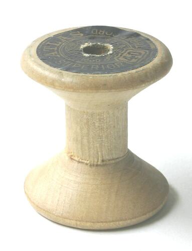 Turned wooden spool with hole drilled through centre. Features a black paper label with gold printed text affixed to one end. There are black and gold paper remnants and four nail heads visible at opposite end circling the drilled hole.