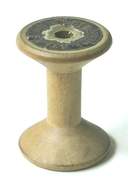 Turned wooden spool with a hole though the centre. A round black label printed with gold lettering is adhered to one end.