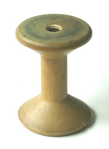 Turned wooden spool with hole drilled through centre and a black number stamped on one end. There is a small wedge cut on wooden edge of spool at end where number is located.