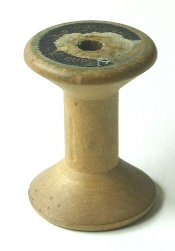 Turned wooden spool with a hole though the centre. Remnants of a round black label printed with gold lettering is adhered to one end, with a plain black label on the other.