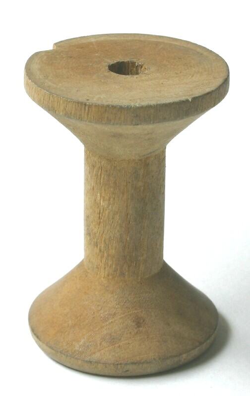 Turned wooden spool with a hole though the centre.