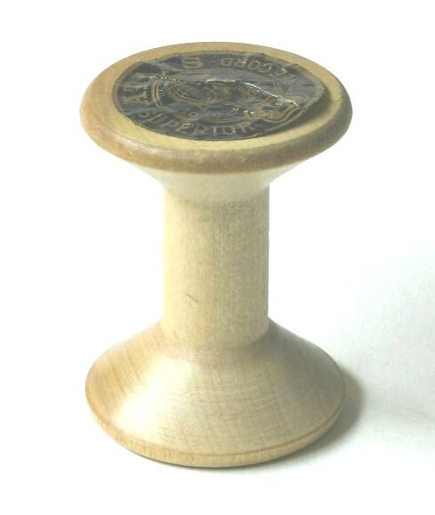 Turned wooden spool with hole drilled through centre. Features a black paper label with gold printed text affixed to each end. One label covers the hole.