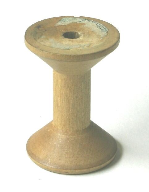 Wooden spool "Atlas Superior" from the countermarch floor loom, circa 1945. Which was constructed for Anna Apinis by fellow survivors of World War II in a displaced persons camp in Germany, using wood from bombed out ruins. Anna painstakingly sketched and documented ancient Latvian designs from the regional costumes rescued by other Latvian refugee women. She then wove them on her loom with threads gathered by unravelling old scraps of fabric.