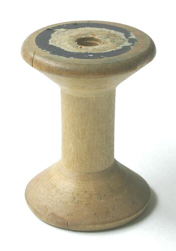 Turned wooden spool with hole drilled through centre and two small slices cut on the wooden edges. Remnants of black paper label at each end.