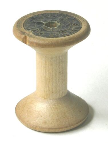 Turned wooden spool with a hole though the centre. Round, black labels with gold text are adhered to either end. One is quite torn.
