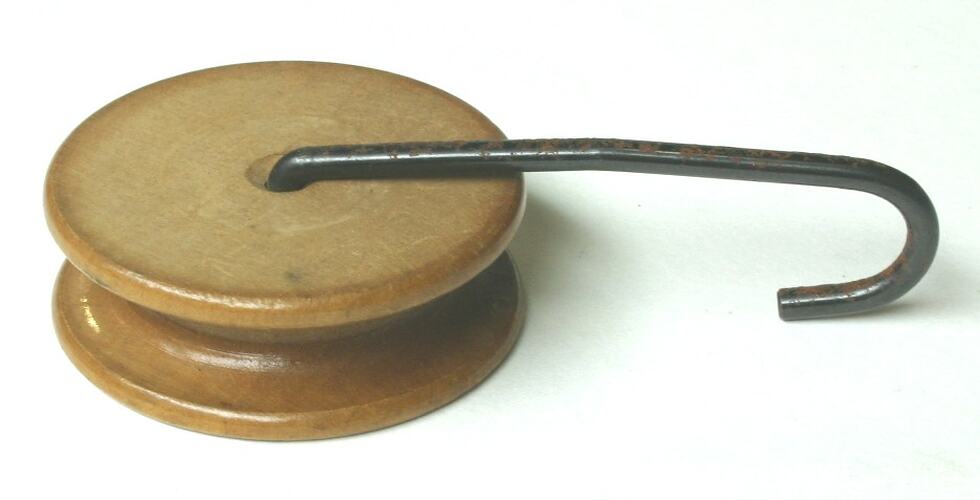 Turned wooden disc with a varnished groove on its edge and hole drilled through its centre. A hooked metal rod is threaded through and attached to the centre section, enabling the disc to spin.