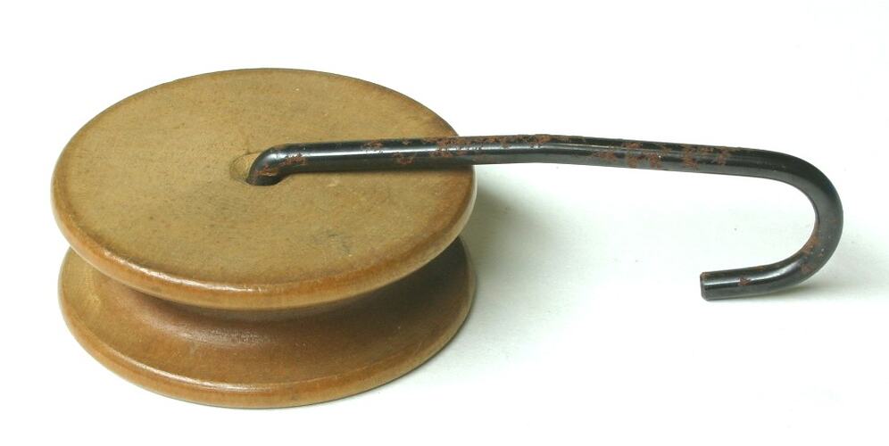 Turned wooden disc with a varnished groove on its edge and hole drilled through its centre. A hooked metal rod is threaded through and attached to the centre section, enabling the disc to spin.