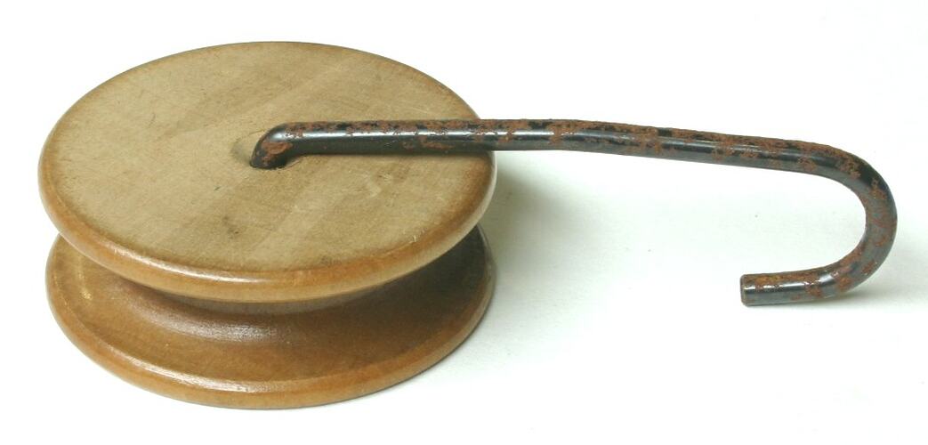 Turned wooden disc with a varnished groove on its edge and hole drilled through its centre. A hooked metal rod is threaded through and attached to the centre section, enabling the disc to spin.