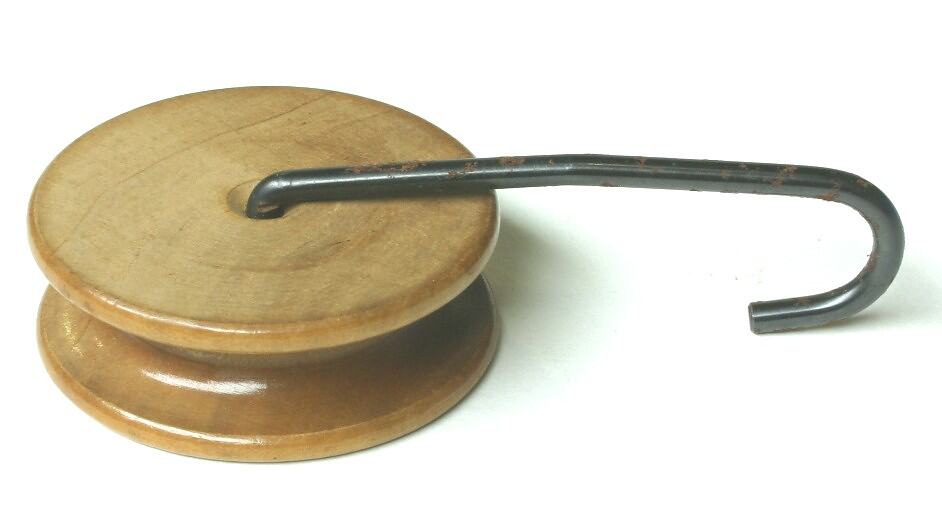 Turned wooden disc with a varnished groove on its edge and hole drilled through its centre. A hooked metal rod is threaded through and attached to the centre section, enabling the disc to spin.