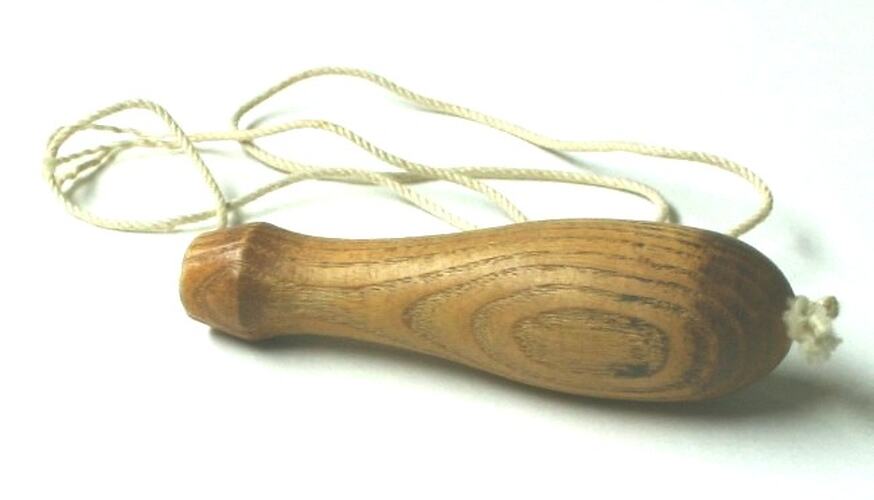 Turned wooden handle with a hole in the centre, through which a white cord is threaded, and knotted at both ends.