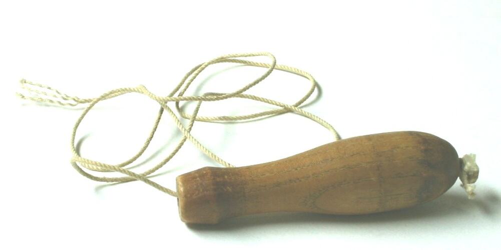 Turned wooden handle with a hole in the centre, through which a white cord is threaded, and knotted at both ends.