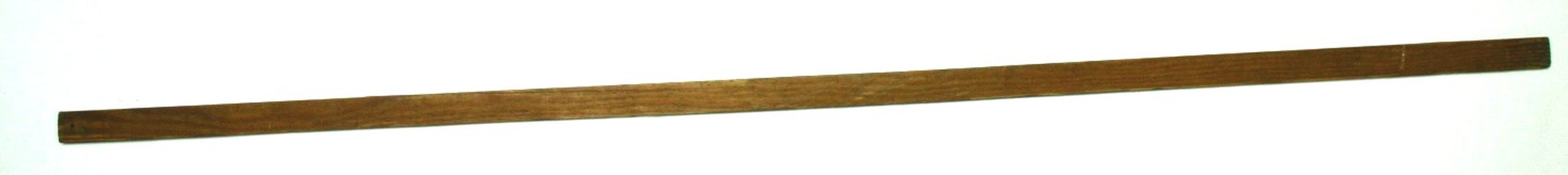 Lease stick from the countermarch floor loom. Used to hold the cross together when warping the loom. The holes at either end assist in tying lease sticks together and/or attaching them to the loom frame for support. The Countermarch Floor Loom was made for Anna Apinis by fellow survivors of World War II, in Memmingen, a displaced persons camp in Germany with wood scavenged from bombed-out ruins. It was designed by Anna's husband Ervins. Anna used the loom to weave traditional Latvian designs using threads gathered by unraveling old scraps of fabric. Anna brought the loom with her to Australia and continued to weave Latvian designs on it.