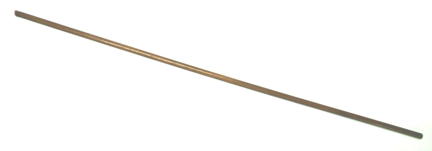 Thin, round, dark brown wooden rod. It is varnished and has one hole drilled at either end.