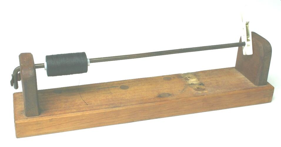 Wooden frame comprising a rectangular base with two vertical ends. A round metal rod is inserted through the ends, parallel to the base. The rod features a hooked end, which fits into a metal brake band at one end. A reel of black cotton is inserted onto the rod, with a white plastic clothes peg clipped on. There is a worn marking and holes on the base where another piece was once attached.