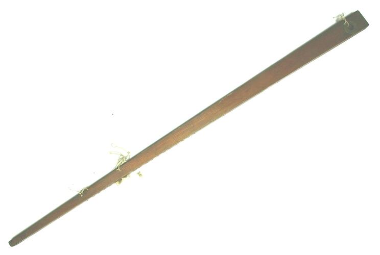 Rectangular, dark wooden beam that tapers at one end. The thicker end has a large hole drilled through the side that contains a metal eyelet. Towards the thinner end there are 19 smaller holes drilled through the top, some of which are threaded and knotted with a white treadle cord.