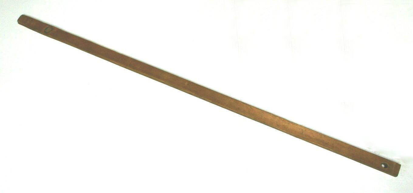 Lam from the countermarch floor loom. Lams are attached to the treadles (foot pedals) via treadle cords or a tie-up. They are the part of the mechanism that actually lifts and lowers the shafts on the loom. The Countermarch Floor Loom was made for Anna Apinis by fellow survivors of World War II, in Memmingen, a displaced persons camp in Germany with wood scavenged from bombed-out ruins. It was designed by Anna's husband Ervins. Anna used the loom to weave traditional Latvian designs using threads gathered by unraveling old scraps of fabric. Anna brought the loom with her to Australia and continued to weave Latvian designs on it.