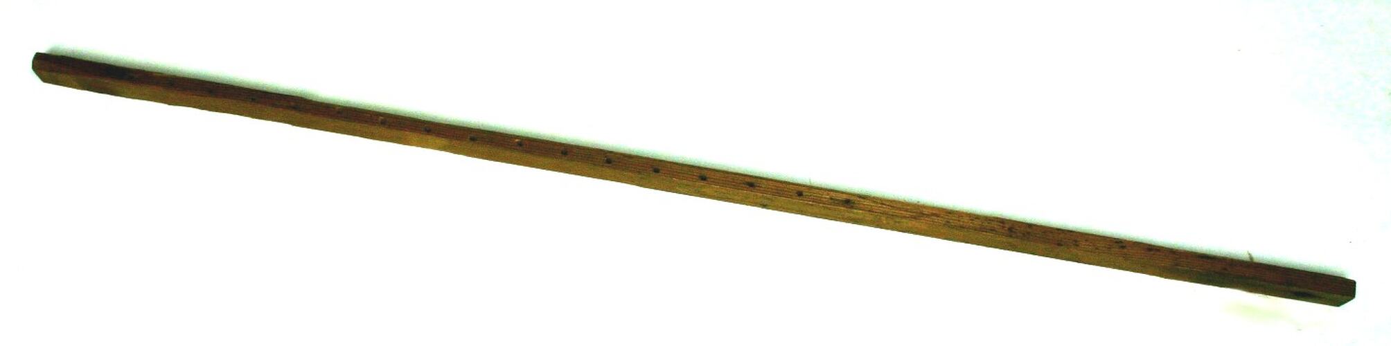 Thin, flat, rectangular wooden stick with 18 holes drilled through the side. The holes are not placed along the entire length of wood. The end where there are no side holes features a larger hole drilled through the top.