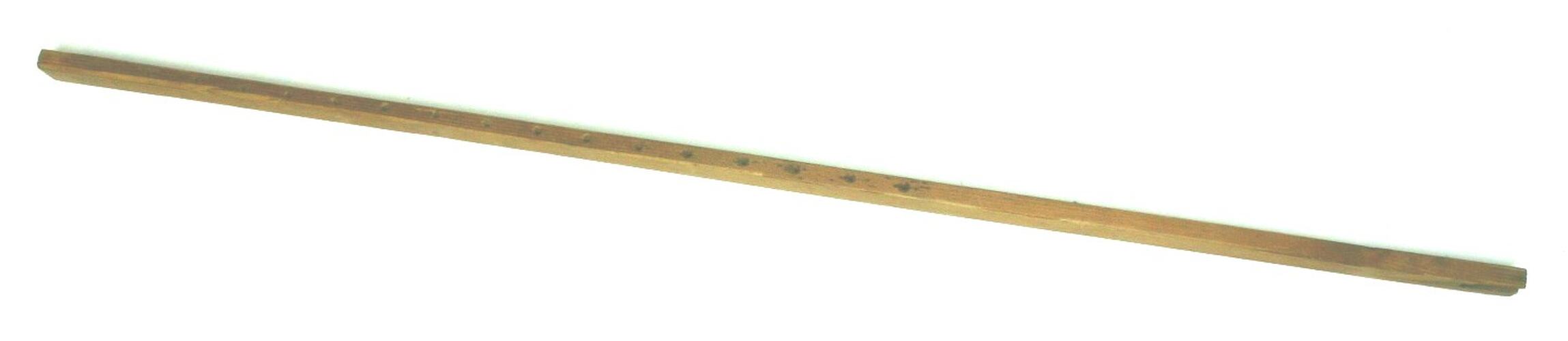 Thin, flat, rectangular wooden stick with 16 holes drilled through the side. The holes are not placed along the entire length of wood. The end where there are no side holes features a larger hole drilled through the top.