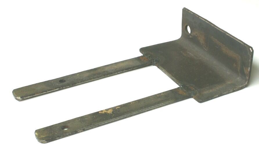 Steel bracket comprising a rectangular plate bent at a 90 degree angle, with a hole at one side. Welded to the plate are two arms, one with a hole through the top.