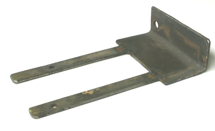 Bracket from the countermarch floor loom. The Countermarch Floor Loom was made for Anna Apinis by fellow survivors of World War II, in Memmingen, a displaced persons camp in Germany with wood scavenged from bombed-out ruins. It was designed by Anna's husband Ervins. Anna used the loom to weave traditional Latvian designs using threads gathered by unraveling old scraps of fabric. Anna brought the loom with her to Australia and continued to weave Latvian designs on it.