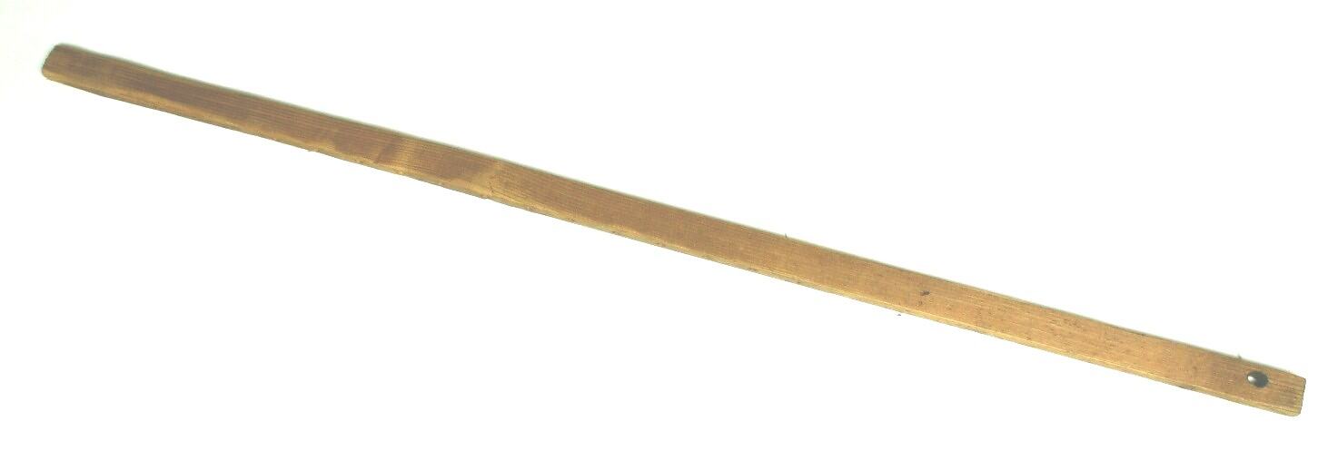 Thin, flat, rectangular wooden stick with 18 holes drilled through the side. The holes are not placed along the entire length of wood. The end where there are no side holes features a larger hole drilled through the top.