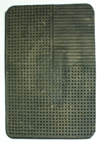 Thin, flat, black rubber pad. Rectangular in shape and with rounded corners it features, on one side, small raised nodules with a grooved section in one corner. Several raised nodules on reverse also.