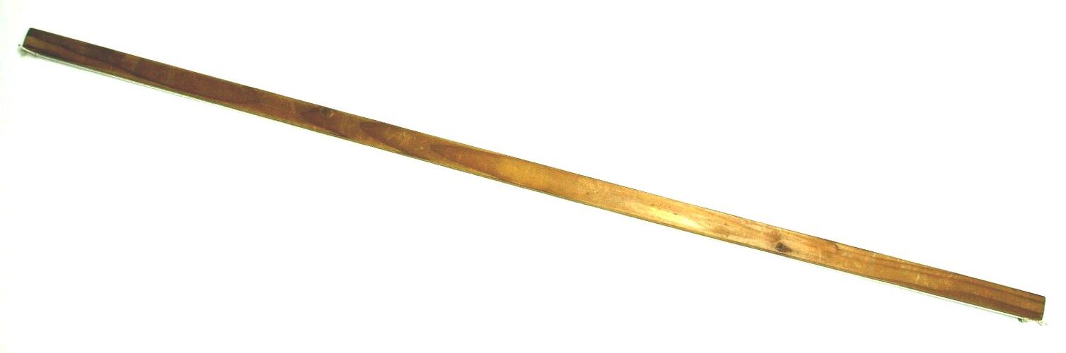 Long, narrow, rectangular length of wood featuring a small hole and groove at either end. A white cord is threaded through the holes and knotted.