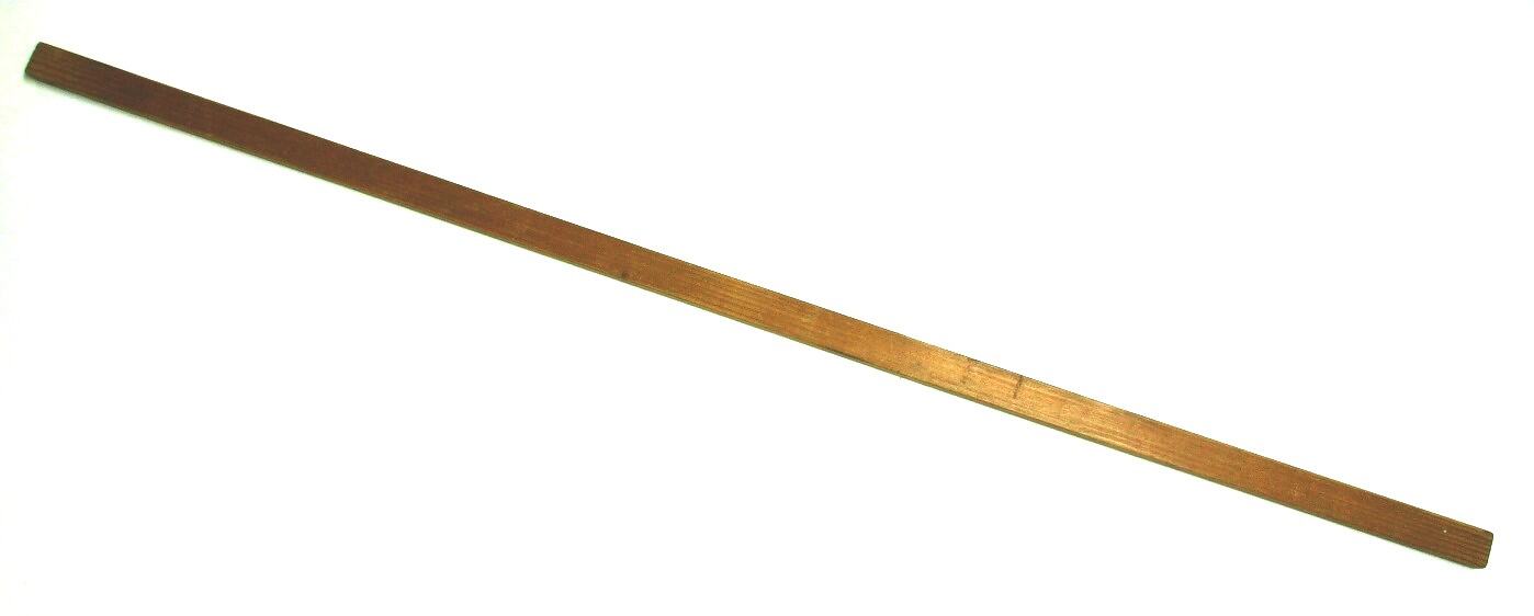Long, narrow, rectangular length of wood featuring a small hole and groove at either end.