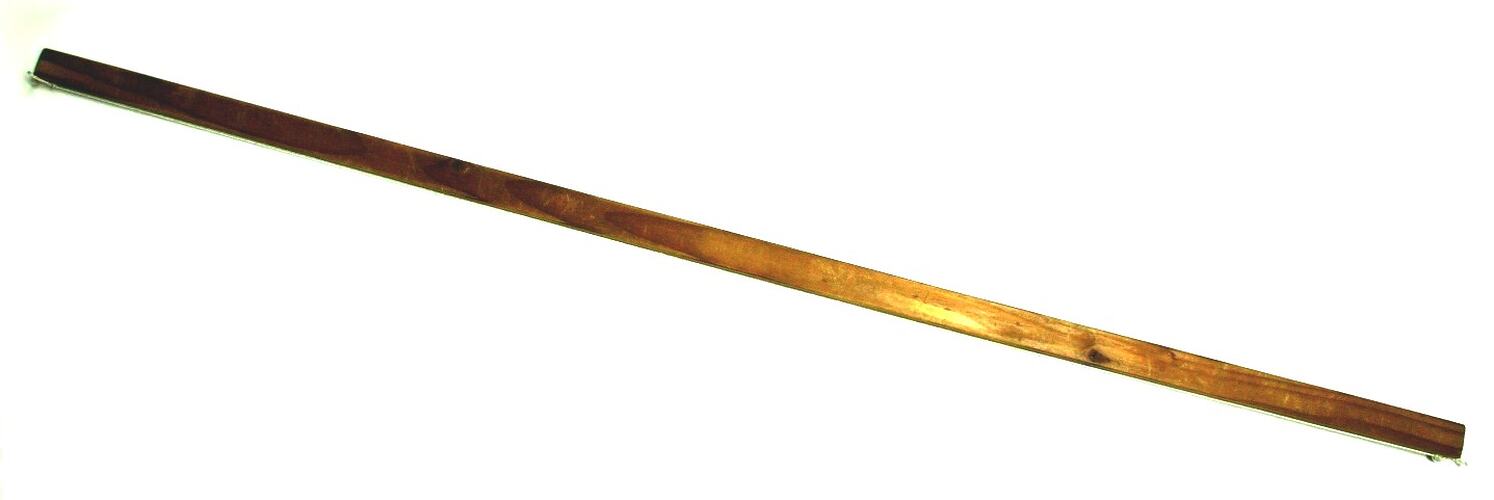 Long, narrow, rectangular length of wood featuring a small hole at either end. A white cord is threaded and knotted through one of the holes.