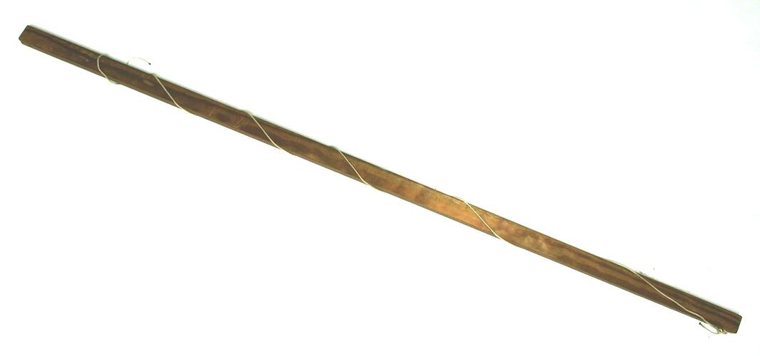 Long, narrow, rectangular length of wood featuring a small hole and groove at either end. A white cord is threaded through one of the holes and knotted.