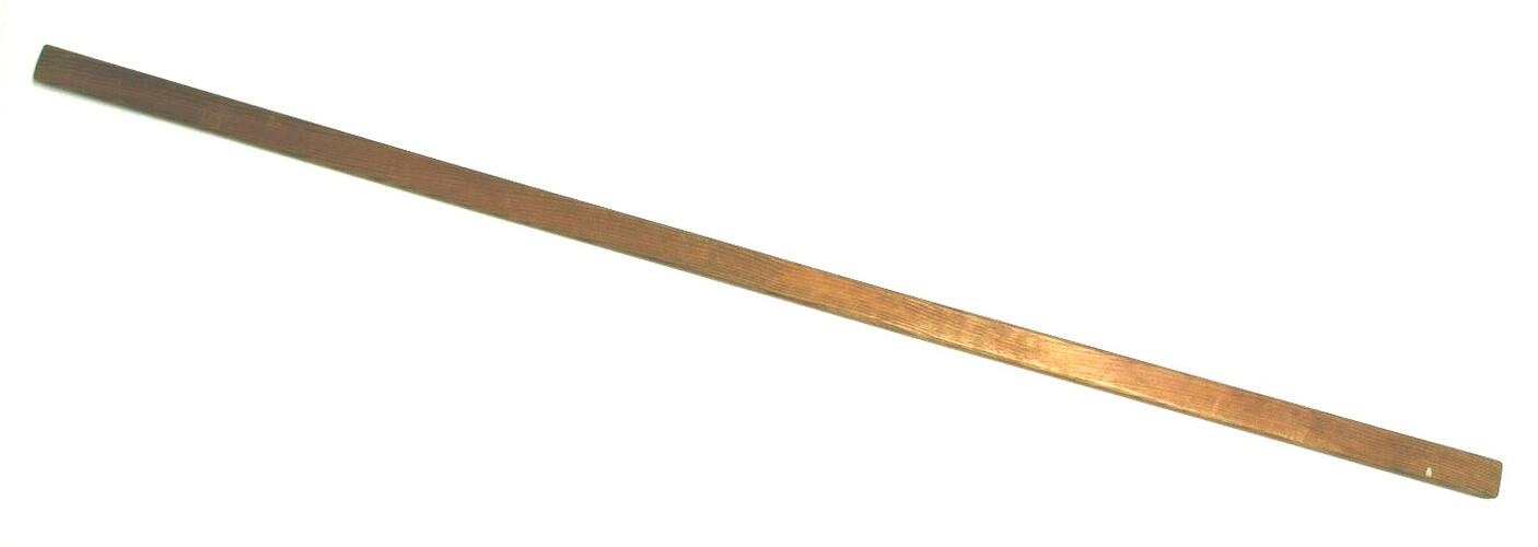 Long, narrow, rectangular length of wood featuring a small hole and groove at either end.