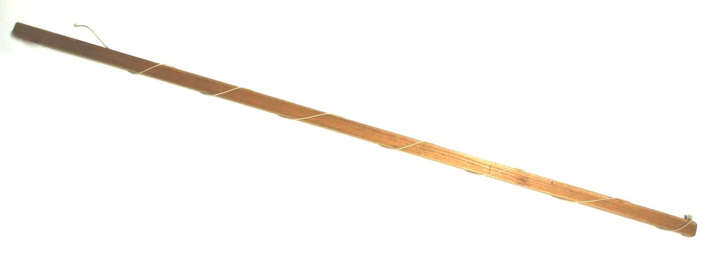 Long, narrow, rectangular length of wood featuring a small hole and groove at either end. A white cord is threaded through one of the holes and knotted.