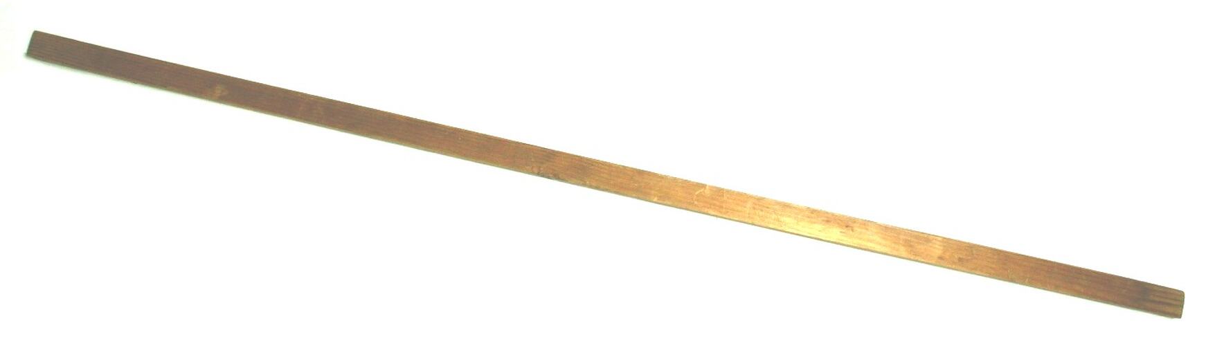 Long, narrow, rectangular length of wood featuring a small hole and grooves at either end. Features a dark circular impression near each end, on one side.