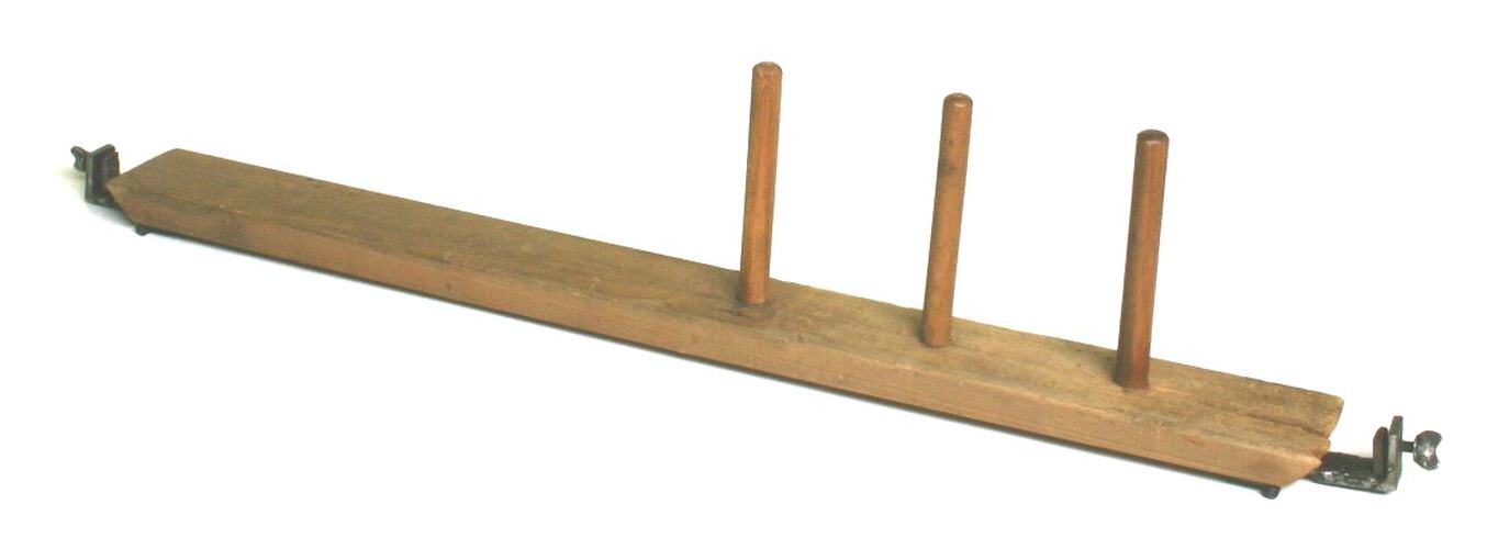 Rectangular length of wood featuring three round pegs affixed horizontally in a row along one half. Metal clasps with butterfly screws are attached to either end.