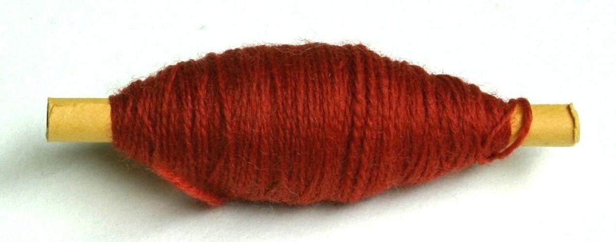 Length of brick-red, woollen thread wrapped around a narrow, yellow paper tube.