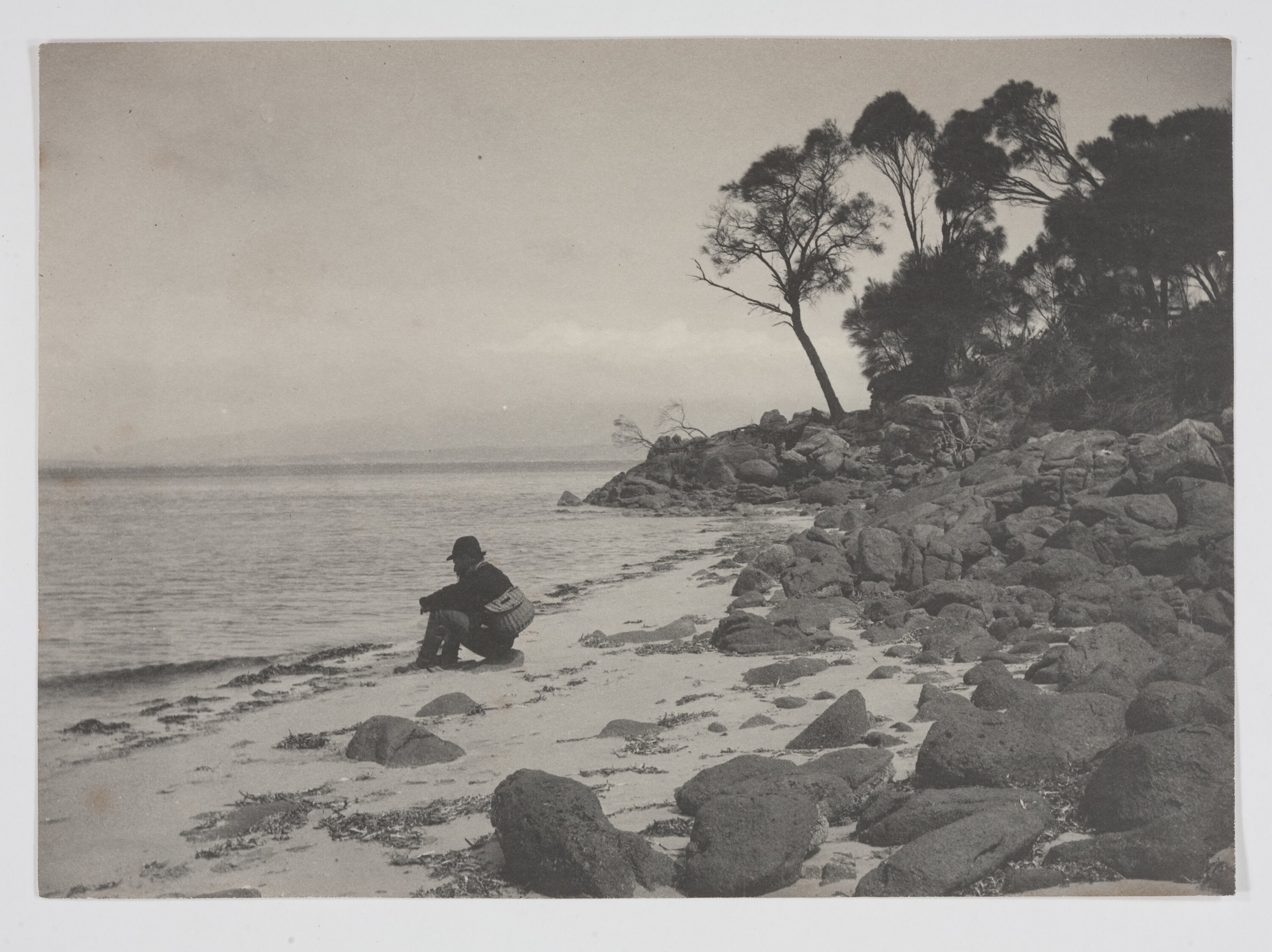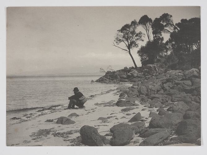 A member of the Field Naturalists Club of Victoria seated on the sand at the mouth of the Big River, Flinders Island. Rocks and tea-trees line the foreshore to the right. Photograph taken by Archibald J. Campbell during the Club's scientific expedition to the Furneaux Group of islands in November 1893.