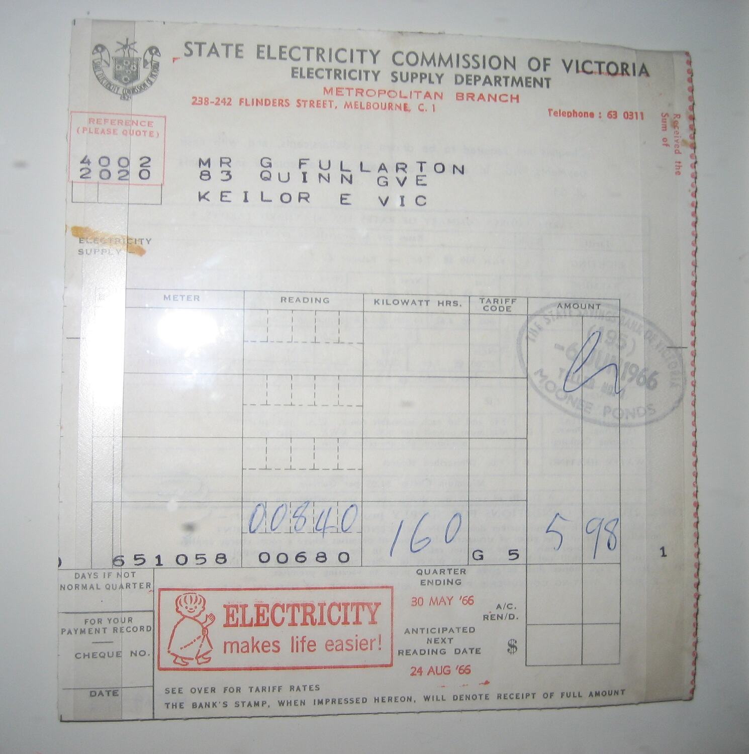 Account from the State Electricity Commission of Victoria, Electricity Supply Department to Mr Graeme Fullarton for electricity use at his residence 83 Quinn Grove, East Keilor, issued for the quarter ending 06 June 1966. Cost of account is $5.98 for 160 kilowatt hours at a G5 tariff. Reverse of account shows tariffs.
