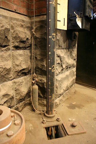 Counterweighted indicator gauge for showing the depth of sewage water in No.3 Pump Well, South Engine Room, Spotswood Sewerage Pumping Station. Indicator column is mounted above floor level against the east wall of the Engine Room, behind Well No.3. The metal column has a scale from 1-15 in feet painted on it. A secondary scale also marked in feet from 1-13, is painted on a separate wooden indicator board fixed to column with metal brackets and offset such that the 1 ft mark on the indicator board is aligned with the 3½ ft mark on the column scale. Both scales marked in feet, with intermediate marks at each quarter foot (3 inches). Scale ratio is 1:1 (1 foot = 304.8 mm).