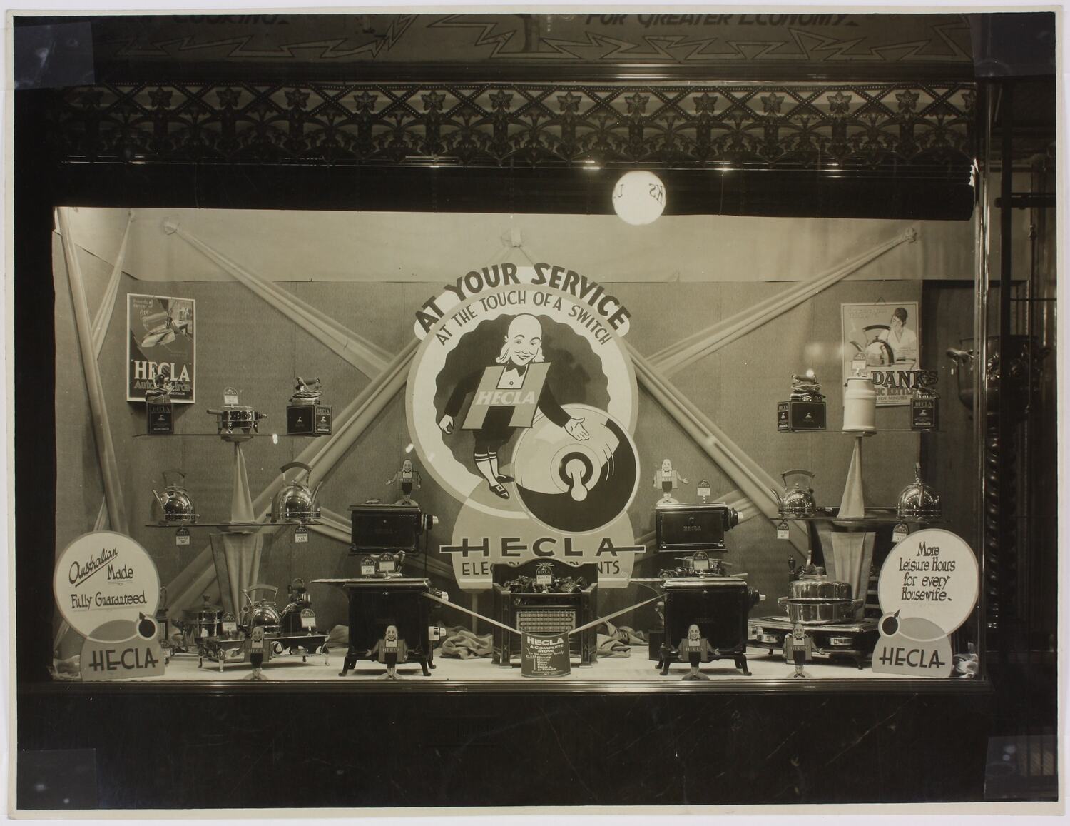 Black and white photograph of window display of electrical appliances including cooking stoves, heaters and kettles. Display is lit from within and window is framed by a decorative frieze across the top and the exterior is dark. The centre of the display features a large logo with a man in a black suit and a giant electrical switch. Two publicity signs read: 'At your service at the touch of a switch' and 'More leisure hours for every housewife'.The rear wall is decorated with striped bands of material stretched around the central poster and some of the appliances are elevated on glass shelves.